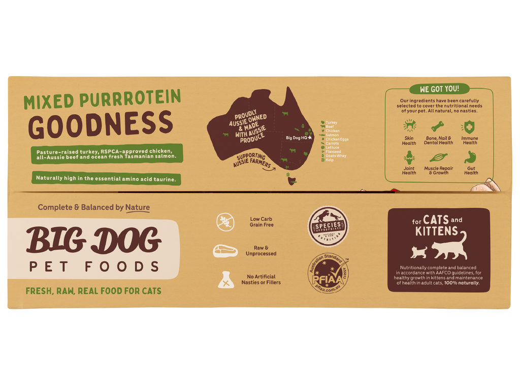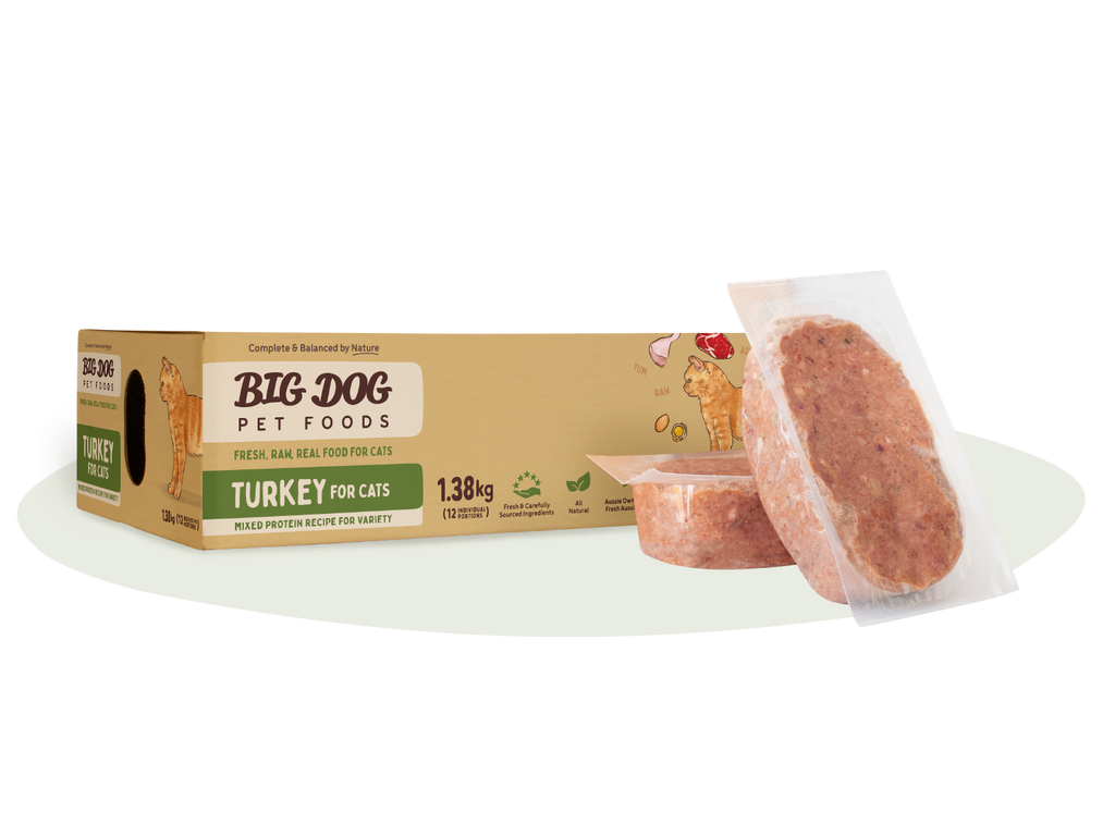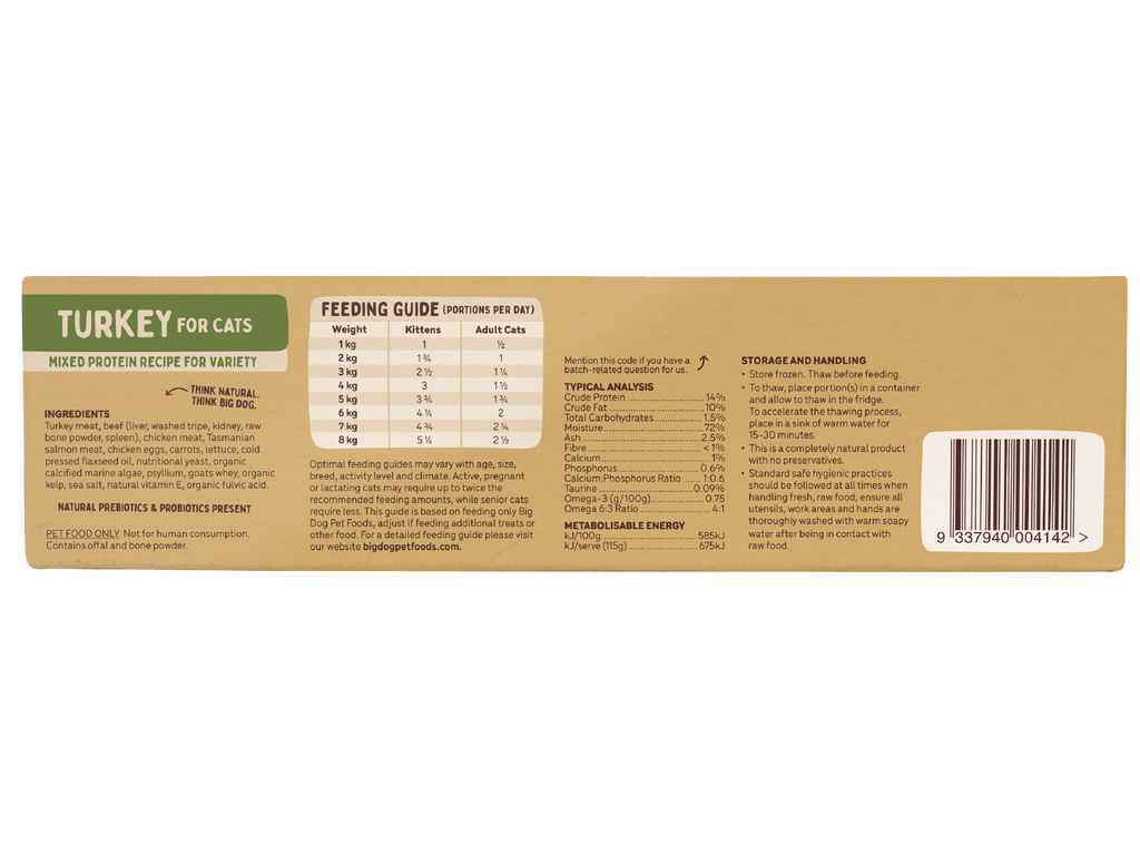 For a lighter flavour, your cat may prefer Big Dog's Turkey for Cats. This mixed protein recipe features turkey as the main protein source and contains the benefit of lean muscle meat, vitamin and mineral-rich offal, calcium-rich raw bone powder as well as biologically appropriate amounts of vegetables, whole eggs and kelp, just to name a few. Your tiny carnivore will gobble up Big Dog's Turkey for Cats!