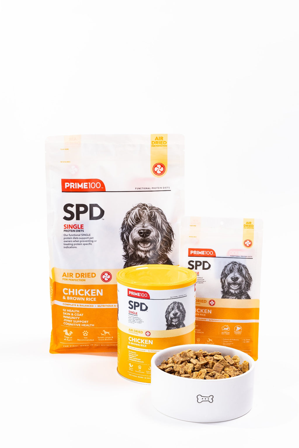 A recipe developed by science and crafted with fresh Australian ingredients. Prime100 SPD™ Air Dried Chicken & Brown Rice is gently air-dried to lock in essential nutrients, and for naturally enhanced palatability and aroma. A scientifically formulated, complete and balanced, single protein diet for dogs of all ages.