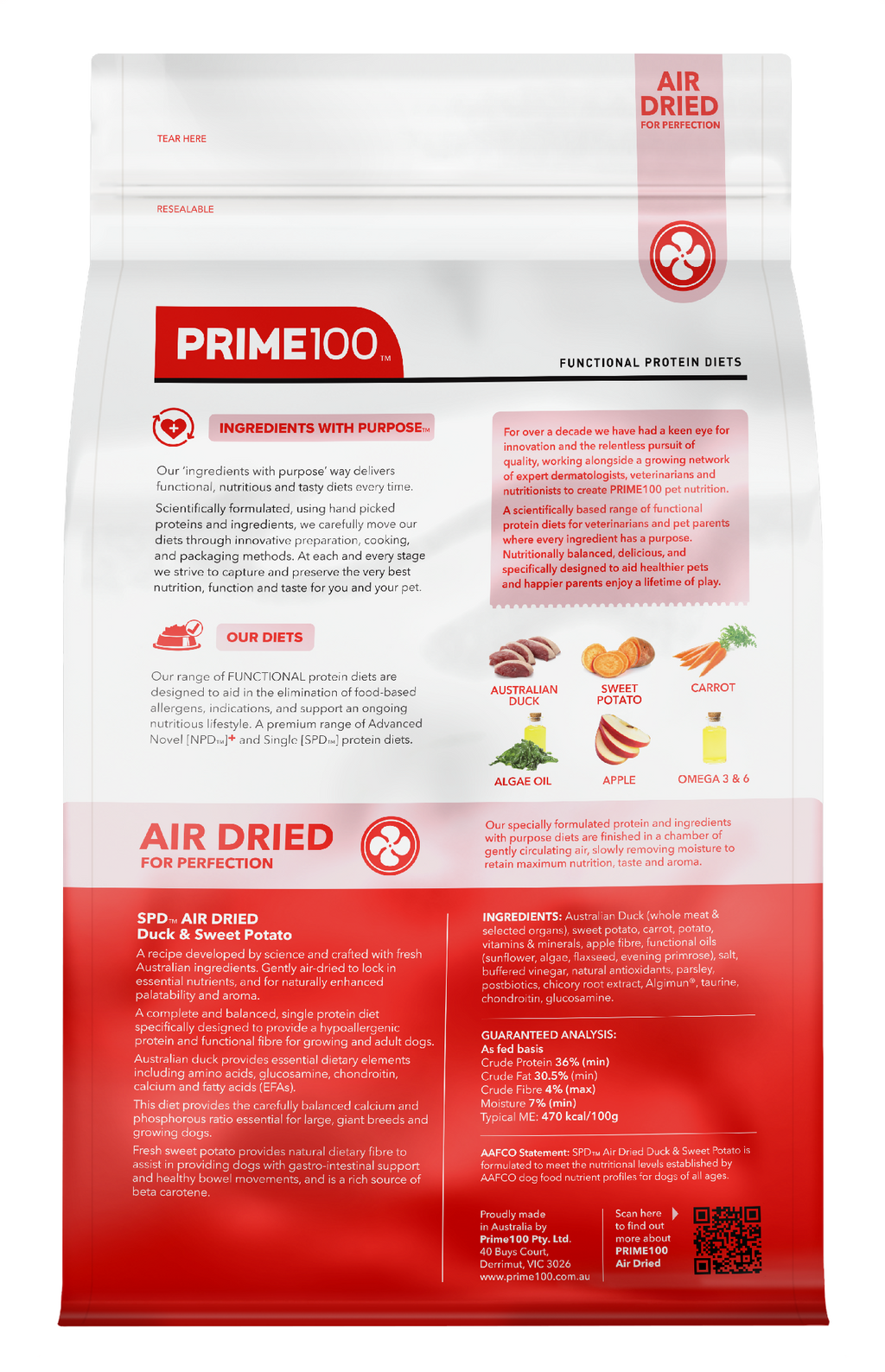 A recipe developed by science and crafted with fresh Australian ingredients. Prime100 SPD™ Air Dried Duck & Sweet Potato is gently air-dried to lock in essential nutrients, and for naturally enhanced palatability and aroma. A scientifically formulated, complete and balanced, single protein diet specifically designed to provide a hypoallergenic protein and functional fibre for growing and adult dogs.