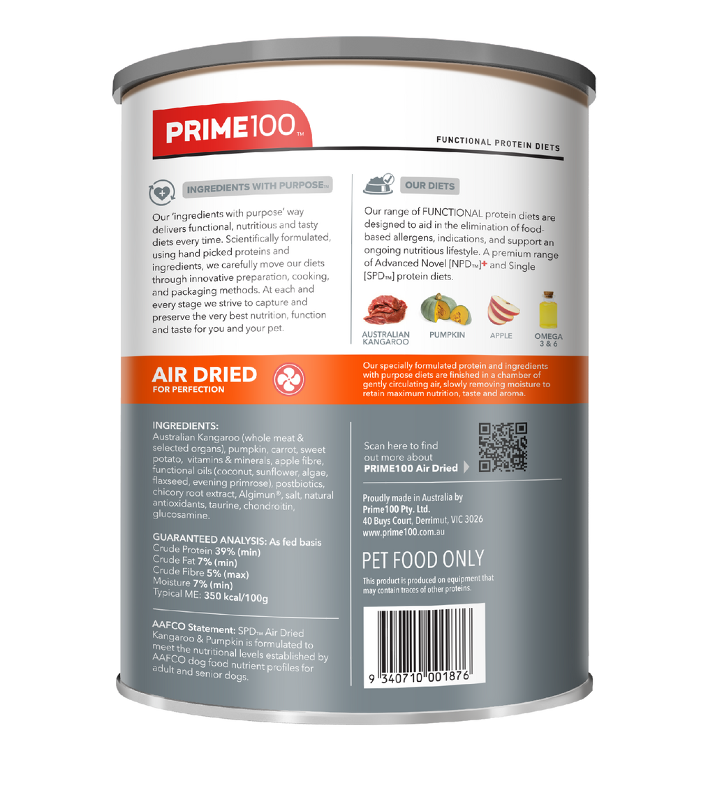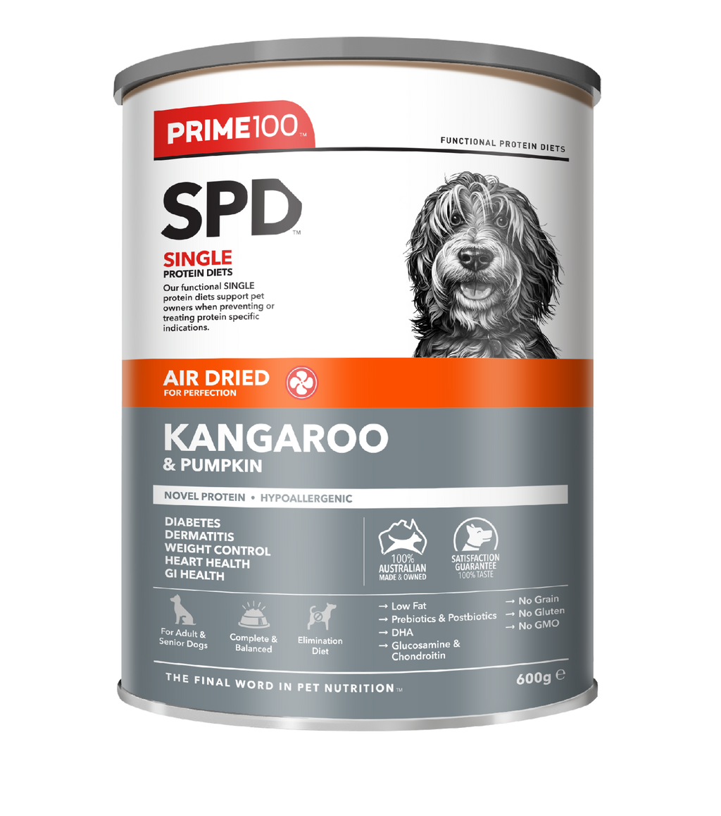 A recipe developed by science and crafted with fresh Australian ingredients. Prime100 SPD™ Air Dried Kangaroo & Pumpkin is gently air-dried to lock in essential nutrients, and for naturally enhanced palatability and aroma. A complete and balanced, single protein diet designed for dogs with low to acute food responsive indications.