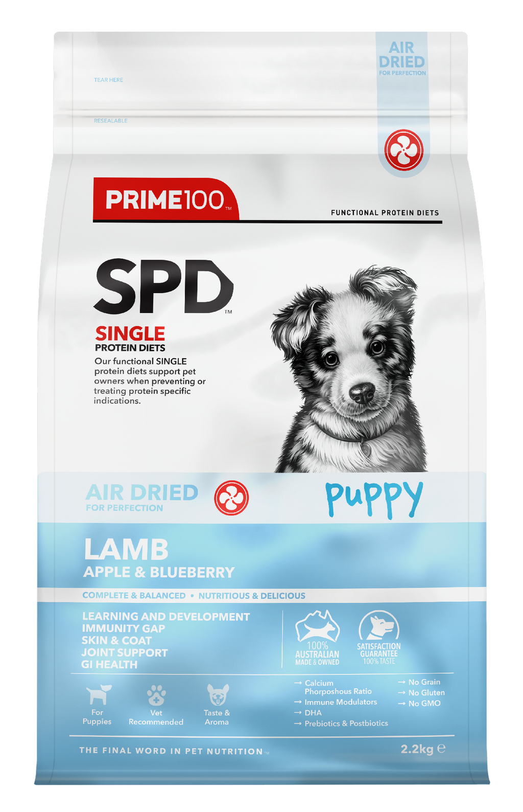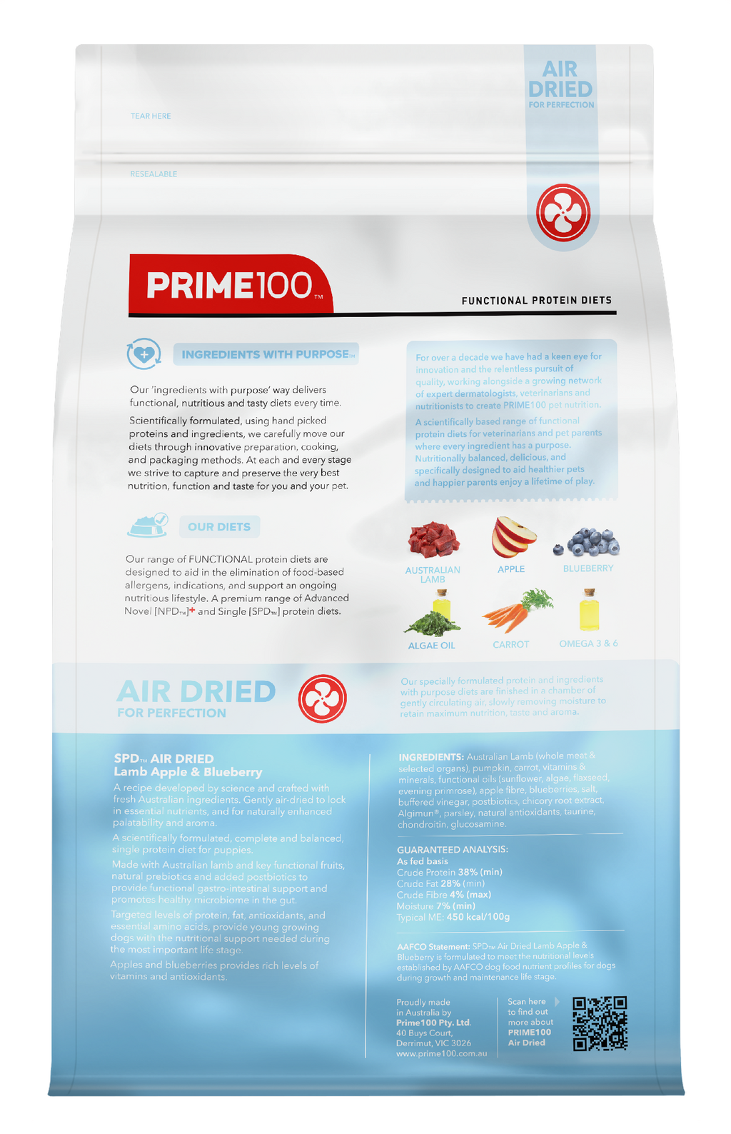 A recipe developed by science and crafted with fresh Australian ingredients. Prime100 SPD™ Air Dried Puppy Lamb Apple & Blueberry is gently air-dried to lock in essential nutrients, and for naturally enhanced palatability and aroma. A scientifically formulated, complete and balanced, single protein diet for puppies.