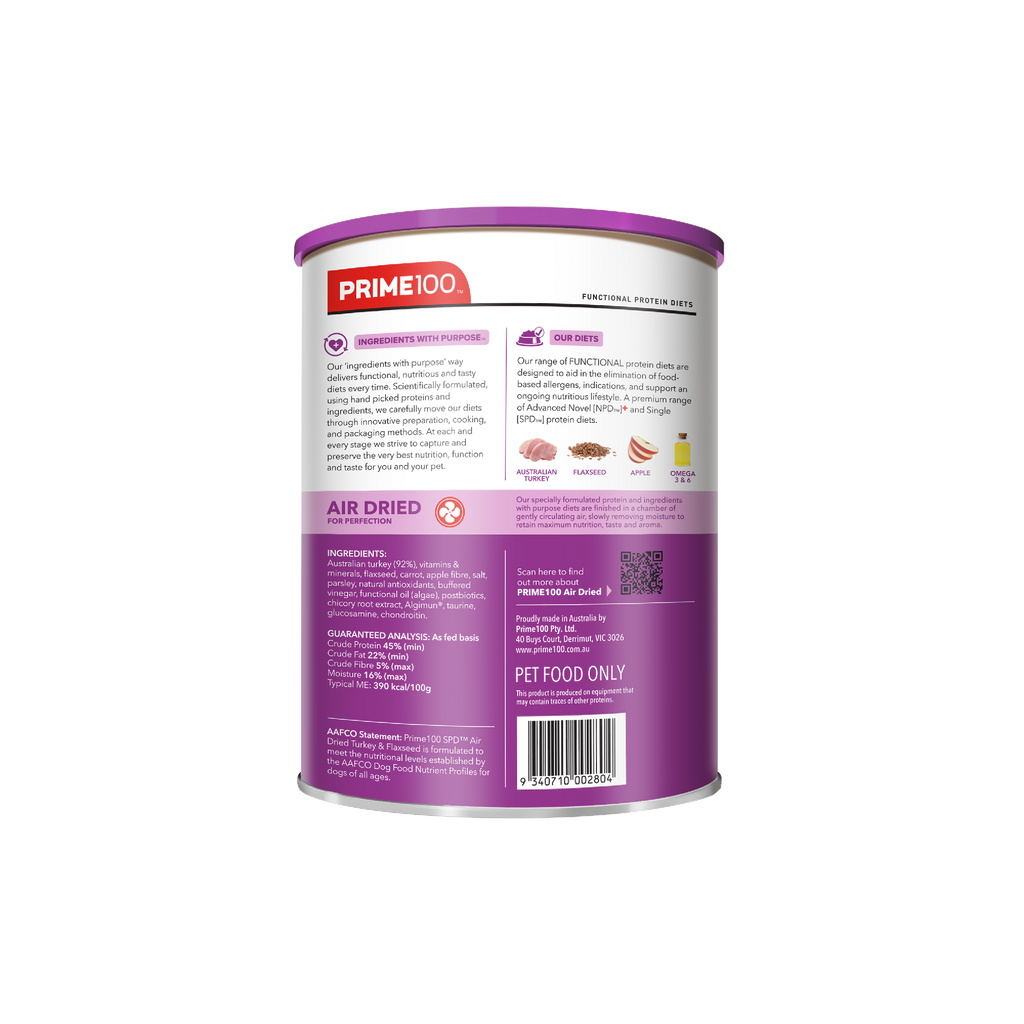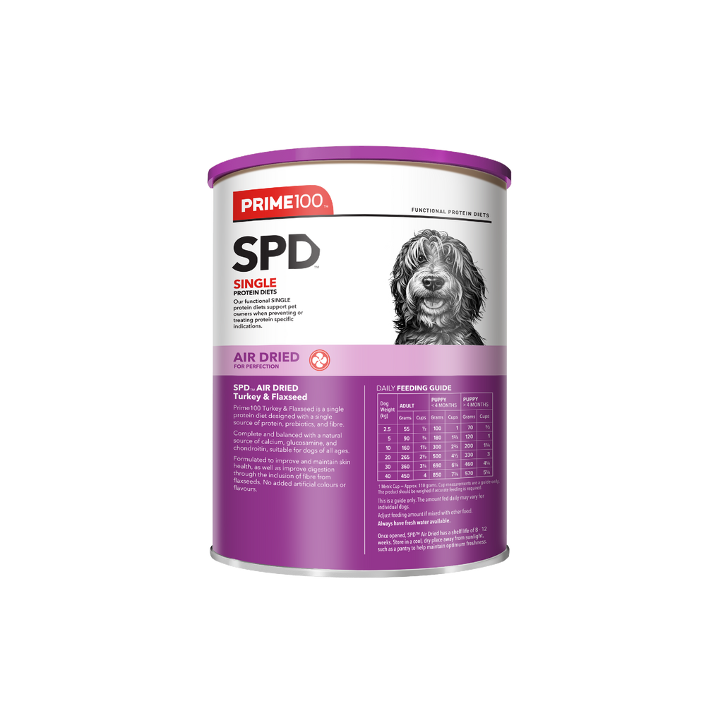 A recipe developed by science and crafted with fresh Australian ingredients. Prime100 SPD™ Air Dried Turkey & Flaxseed is gently air-dried to lock in essential nutrients, and for naturally enhanced palatability and aroma. A scientifically formulated, complete and balanced, single protein diet for dogs of all ages.