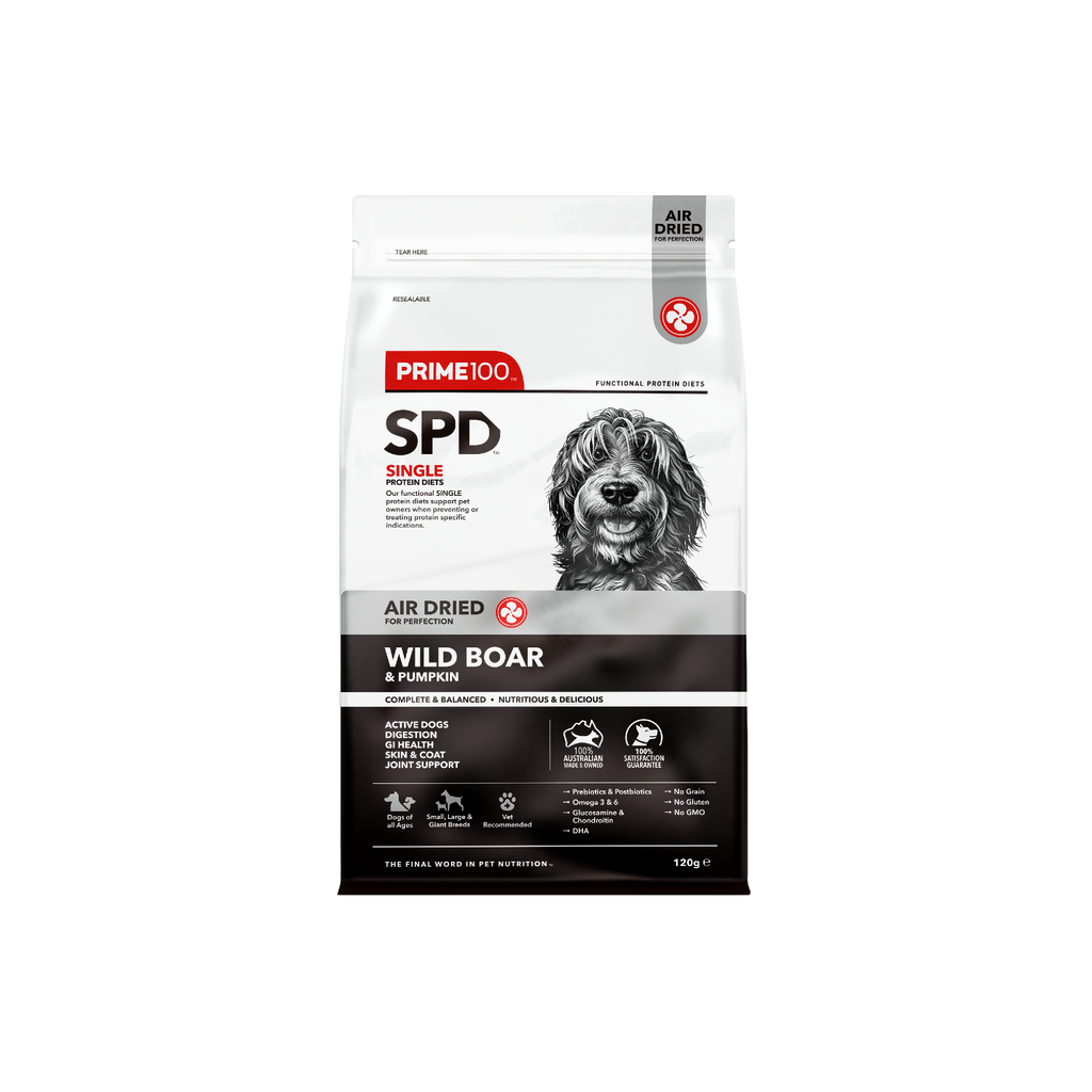 A recipe developed by science and crafted with fresh Australian ingredients. Prime100 SPD™ Air Dried Wild Boar & Pumpkin is gently air-dried to lock in essential nutrients, and for naturally enhanced palatability and aroma. A scientifically formulated, complete and balanced, single protein diet for dogs of all ages.