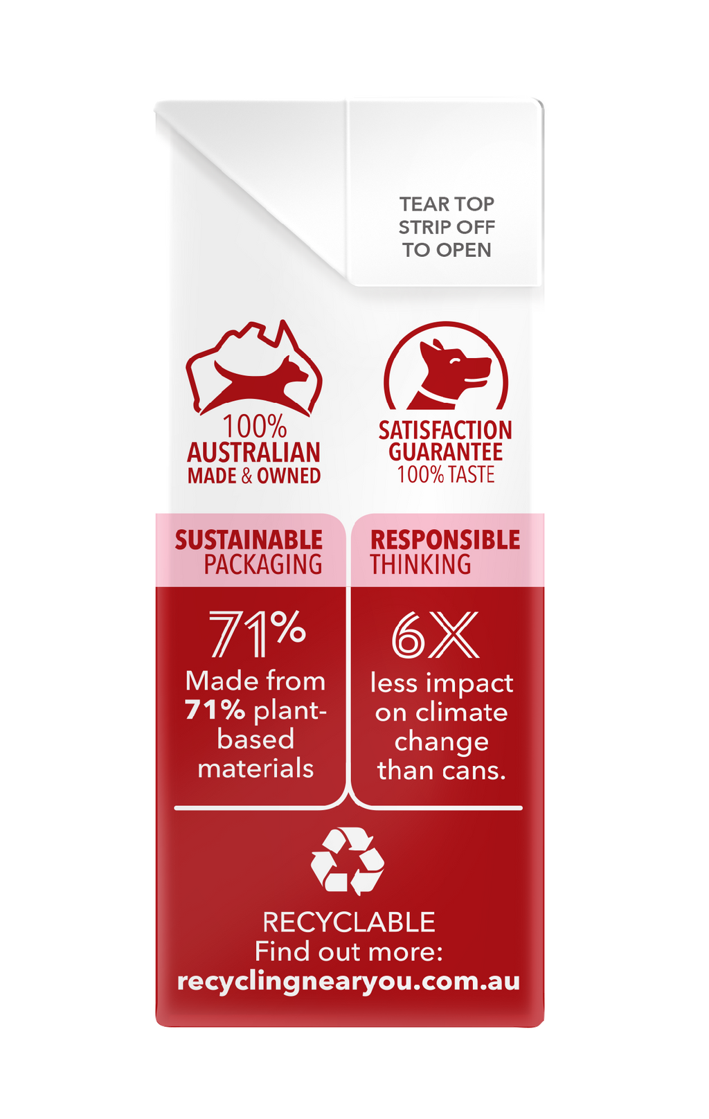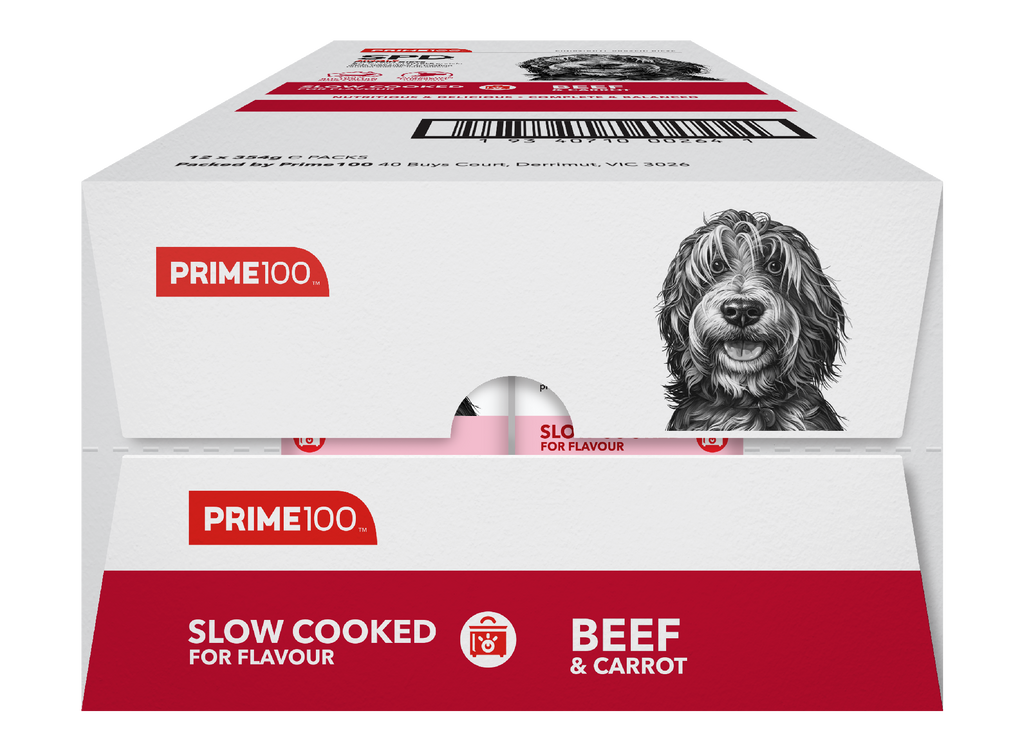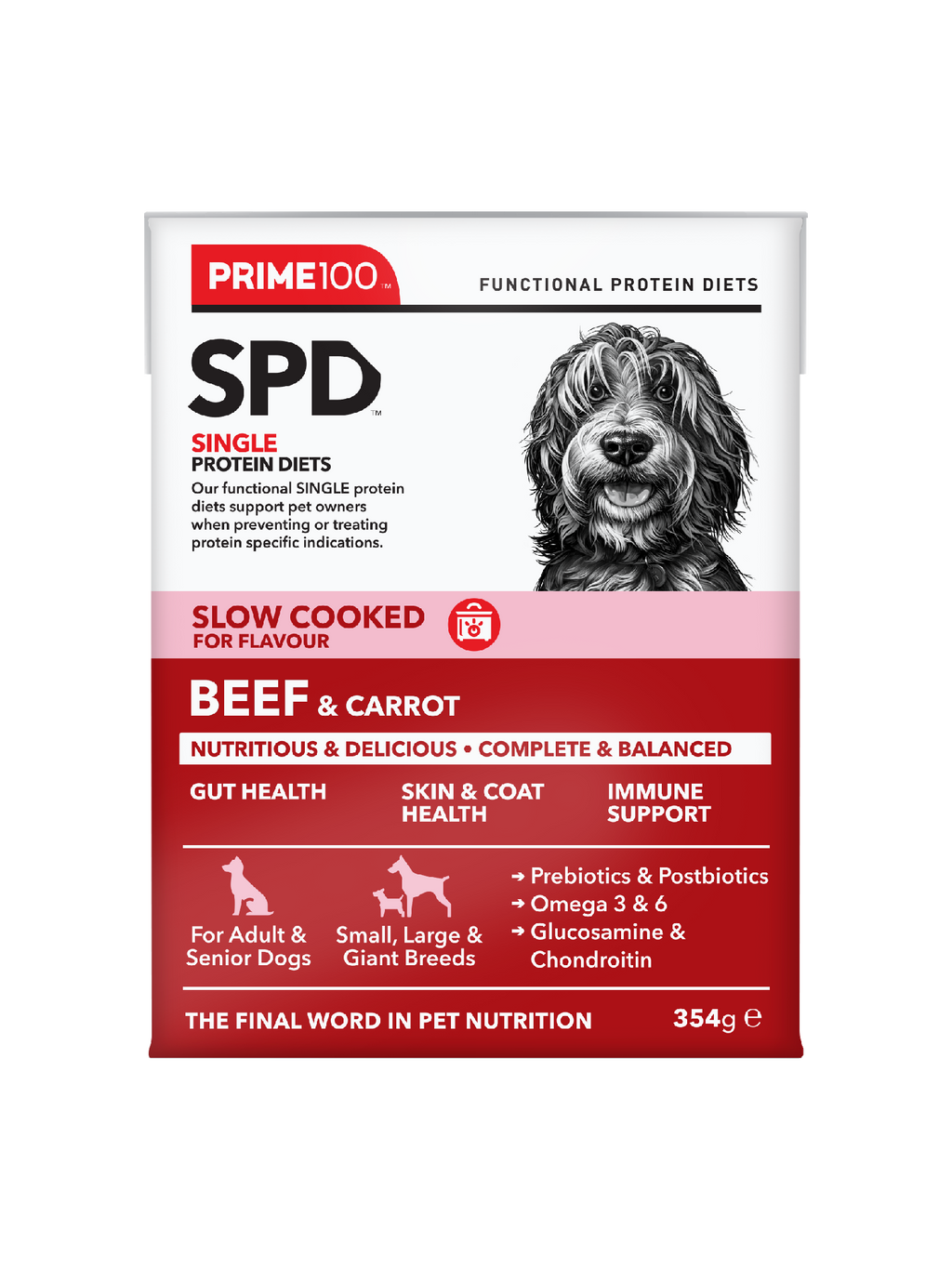 Prime100 SPD™ Slow Cooked Beef & Carrot is a single protein diet specifically designed for adult and senior dogs. Complete and balanced for dogs of all breeds, including giant breeds. No added artificial colours or flavours. Australian Beef provides a rich source of protein to support muscle growth and repair, while carrot adds essential vitamins and minerals to promote overall health and wellbeing.
