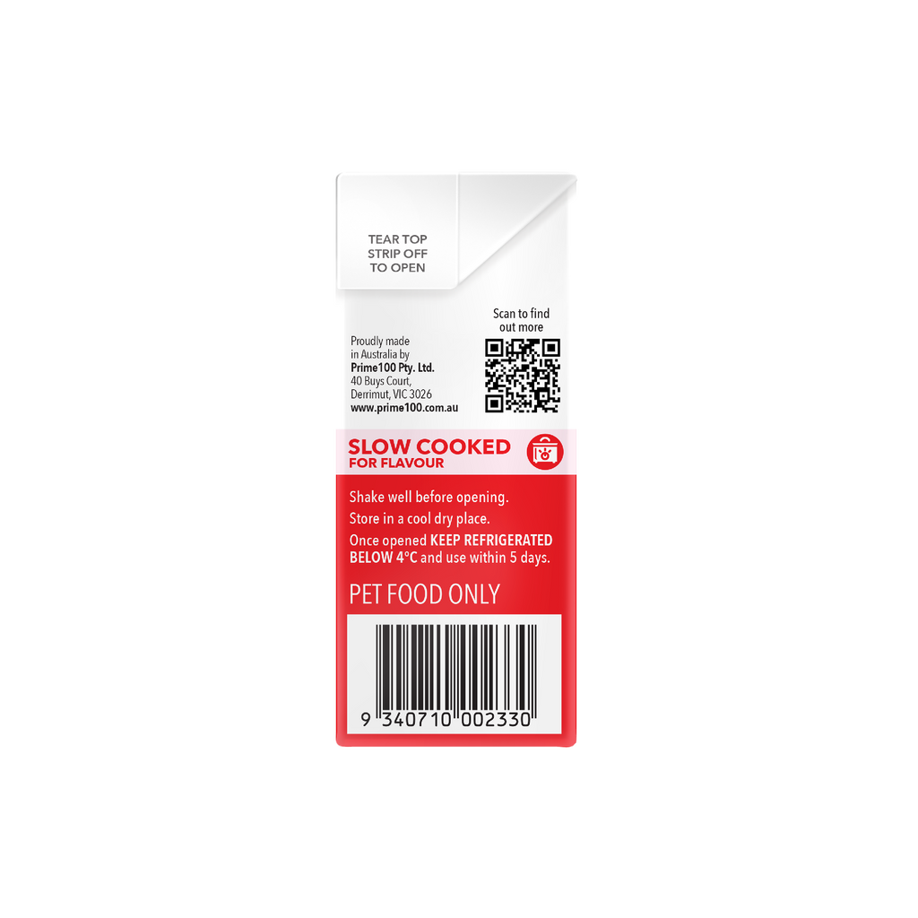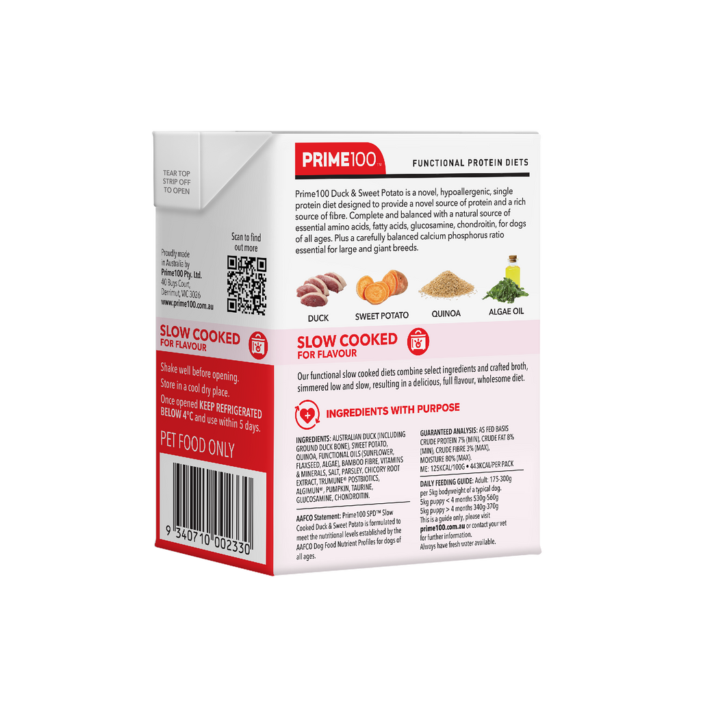 AAFCO Statement: Prime100 SPD Slow Cooked Duck & Sweet Potato is formulated to meet the nutritional levels established by the AAFCO Dog Food Nutrient Profiles for dogs of all ages.