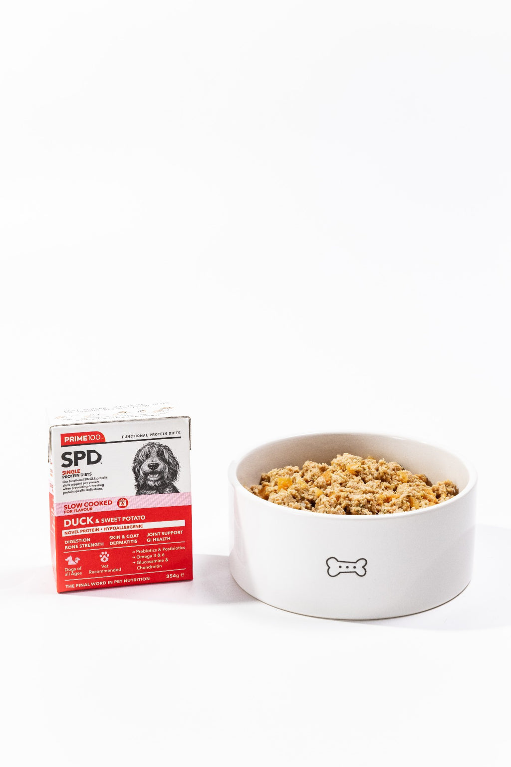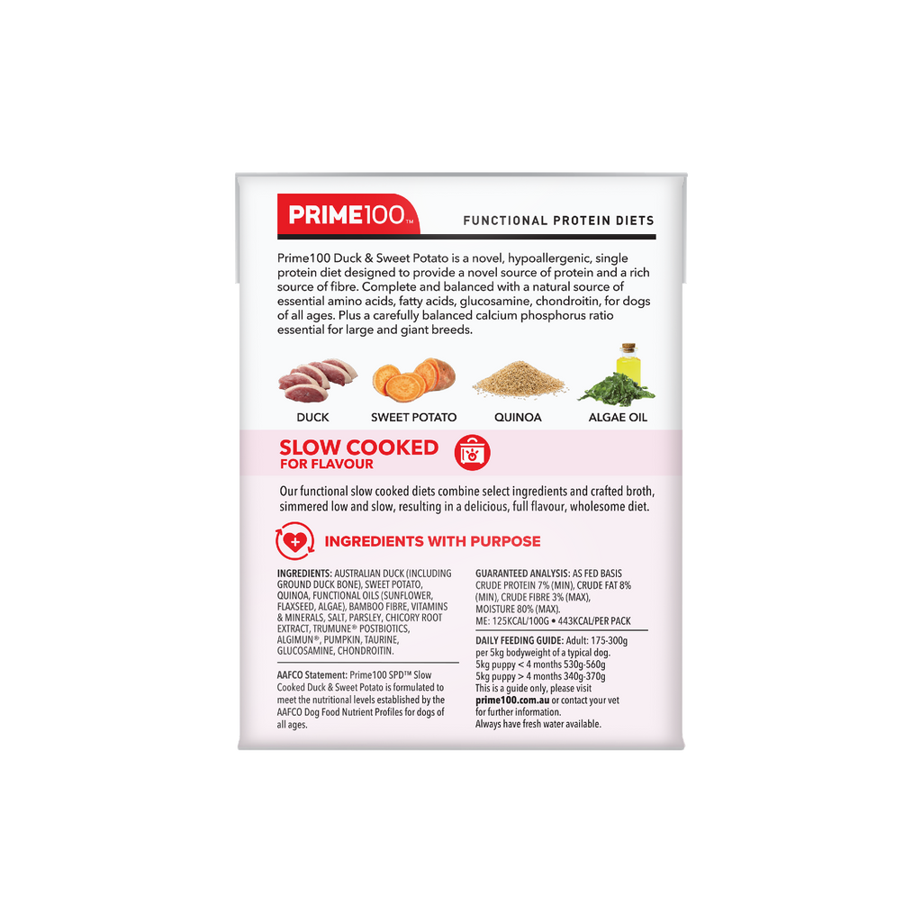 Prime100 SPD™ Slow Cooked Duck & Sweet Potato is a novel, hypoallergenic, single protein diet designed to provide a novel source of protein and a rich source of fibre. Complete and balanced with a natural source of essential amino acids, fatty acids, glucosamine, chondroitin, for dogs of all ages. Plus a carefully balanced calcium phosphorous ratio essential for large and giant breeds.