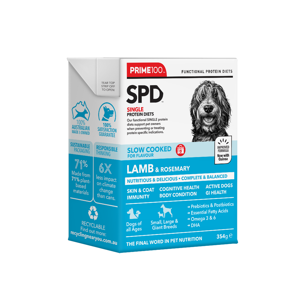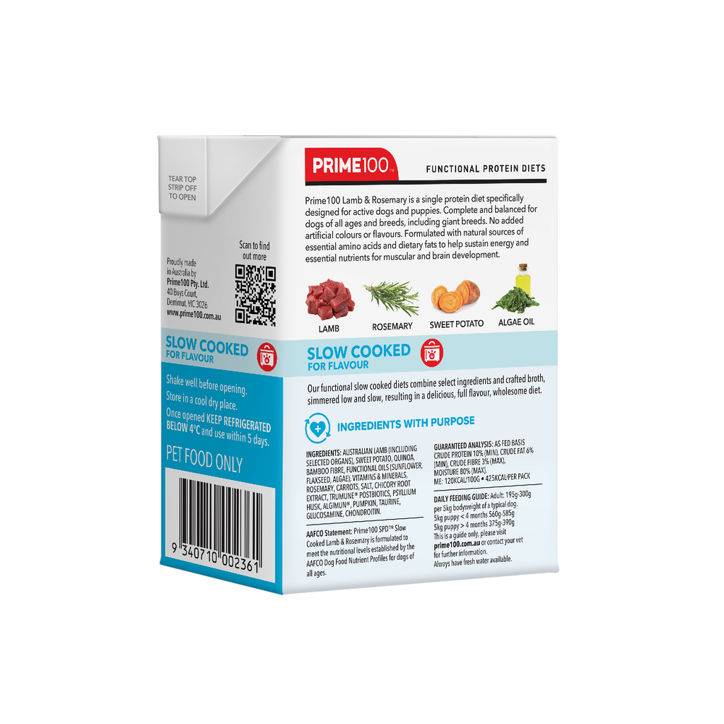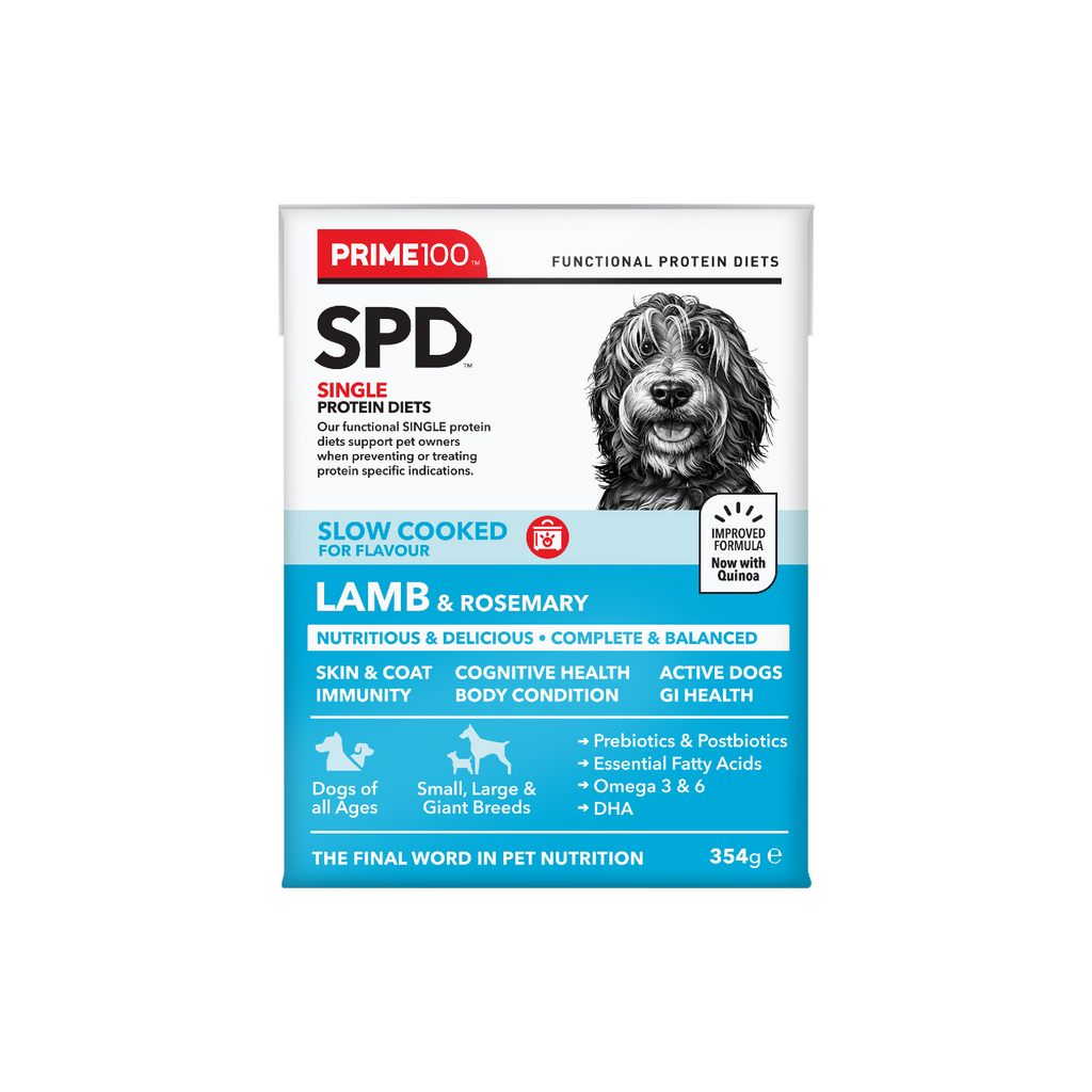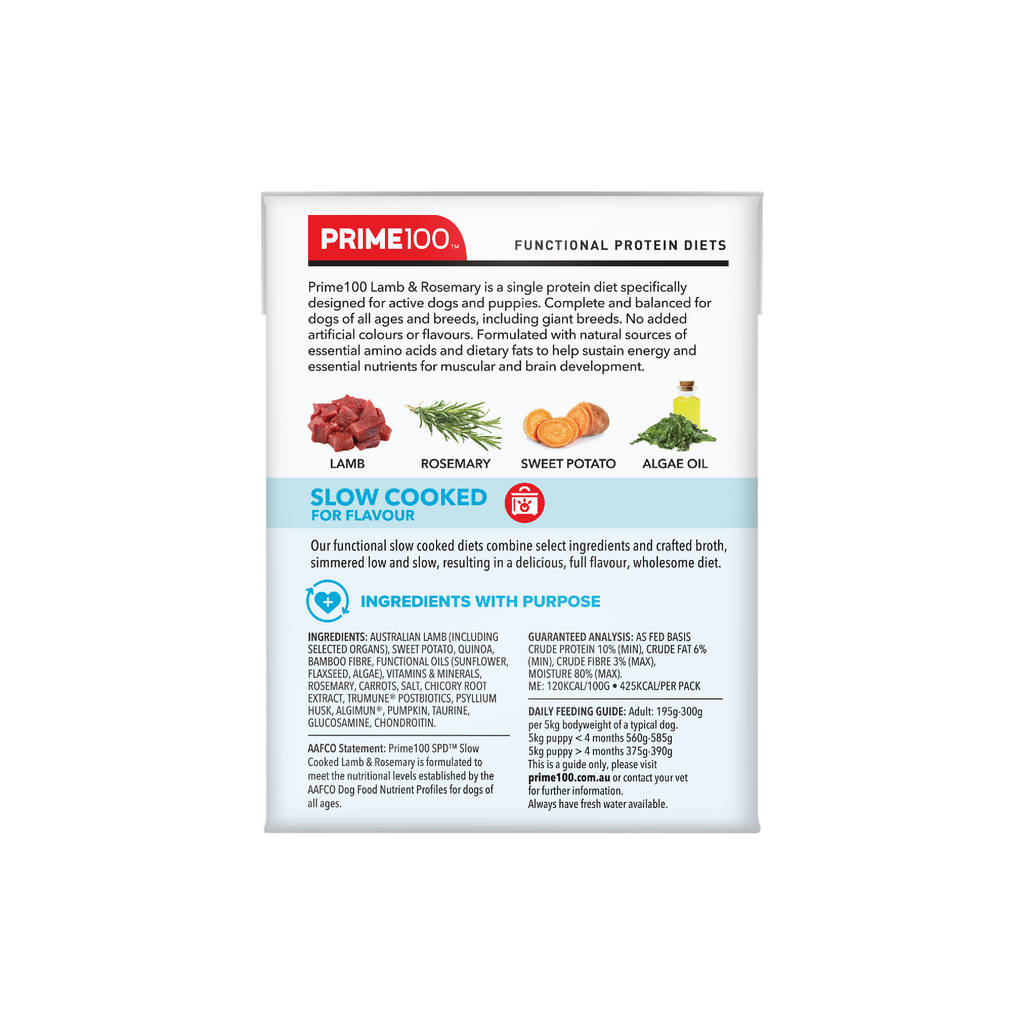 Prime100 SPD™ Slow Cooked Lamb & Rosemary is a single protein diet designed for active dogs and puppies. Complete and balanced for dogs of all ages and breeds, including giant breeds. No added artificial colours or flavours. Formulated with natural sources of essential amino acids and dietary fats to help sustain energy and essential nutrients for muscular and brain development.