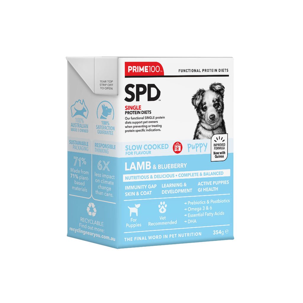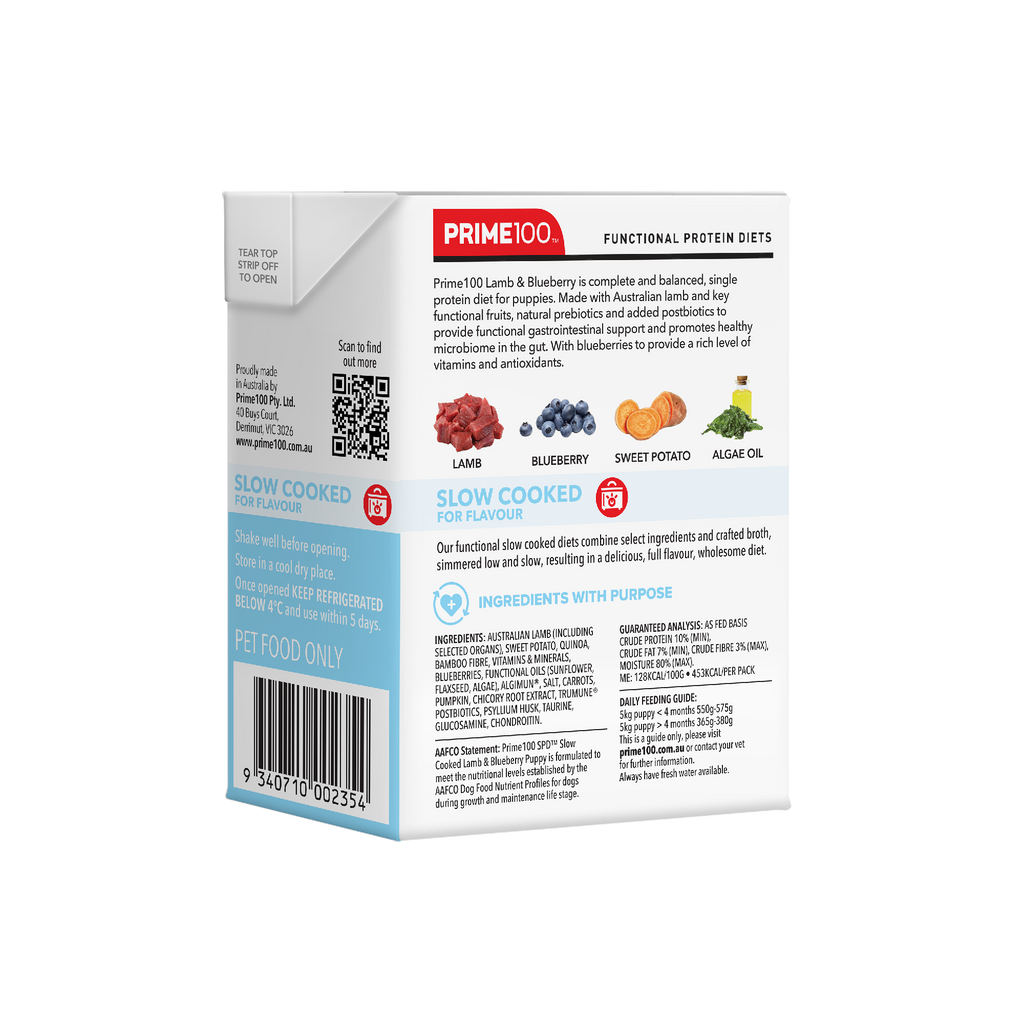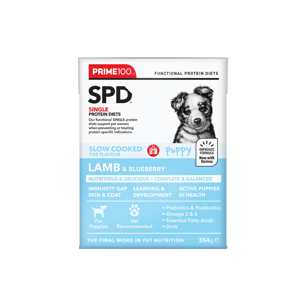 Prime100 SPD™ Slow Cooked Lamb & Blueberry Puppy is a complete and balanced, single protein diet for puppies. Made with Australian lamb and key functional fruits, natural prebiotics and added postbiotics to provide functional gastro-intestinal support and promotes healthy microbiome in the gut. With blueberries to provide a rich level of vitamins and antioxidants.
