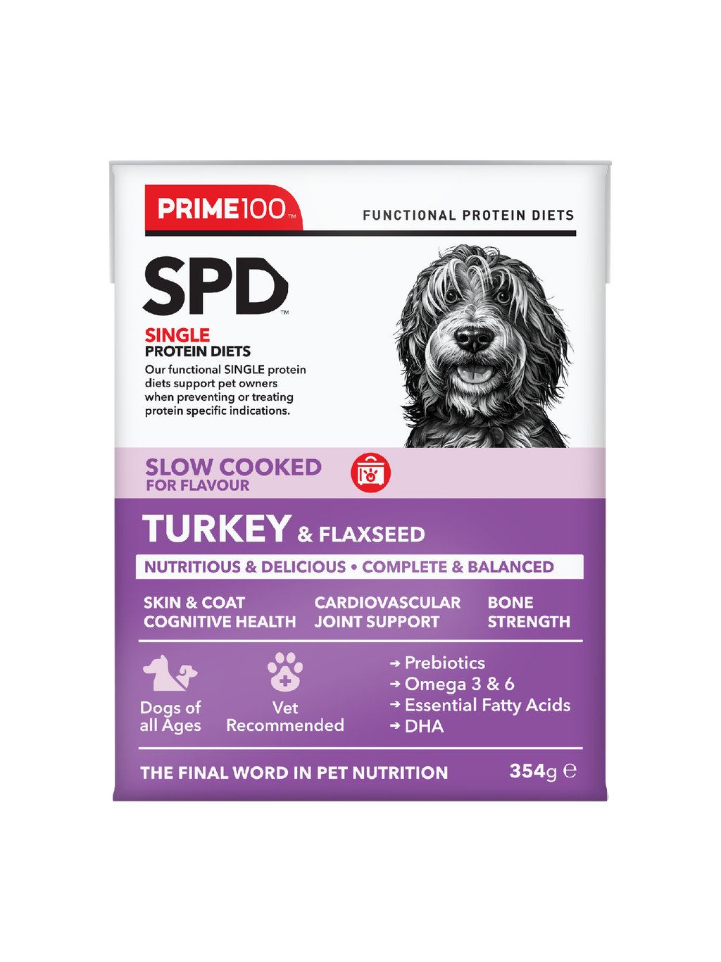 Prime100 SPD™ Slow Cooked Turkey & Flaxseed is a single protein diet designed with a single source of protein, prebiotics, and fibre. Complete and balanced with a natural source of calcium, glucosamine, chondroitin and essential fatty acids, suitable for dogs of all ages (excluding large & giant breed puppies). Formulated to improve and maintain skin health, as well as improve digestion through the inclusion of natural digestive enzymes and fibre from flaxseeds. No added artificial colours or flavours.