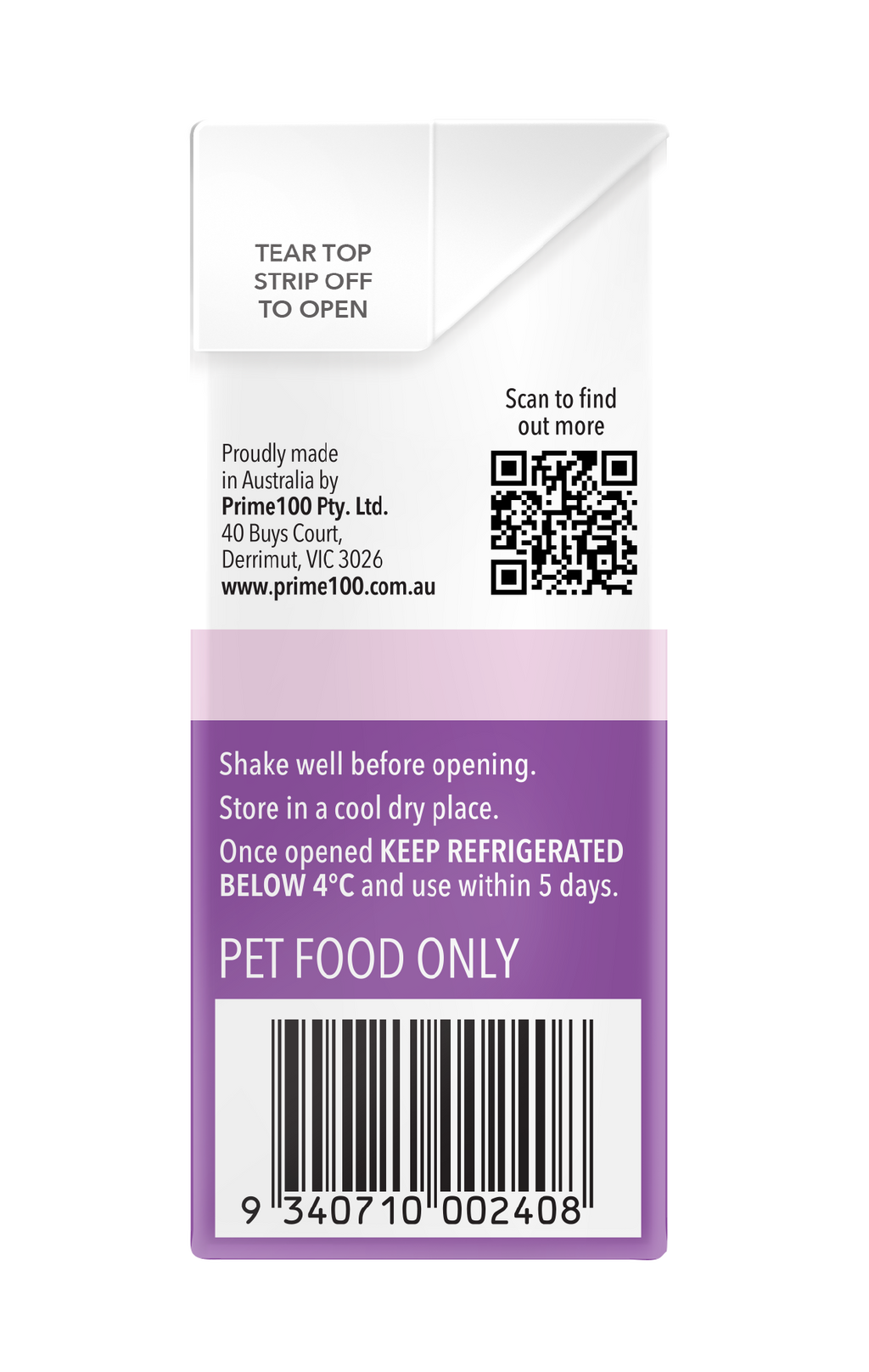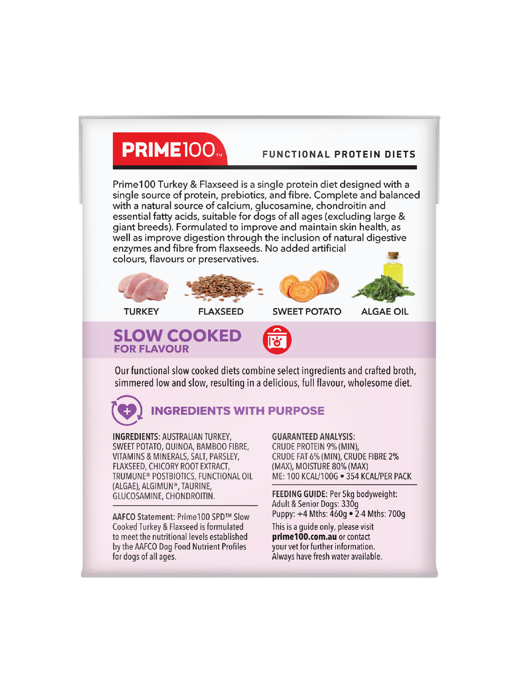 AAFCO Statement: Prime100 SPD™ Slow Cooked Turkey & Flaxseed is formulated to meet the nutritional levels established by the AAFCO Dog Food Nutrient Profiles for dogs of all ages.